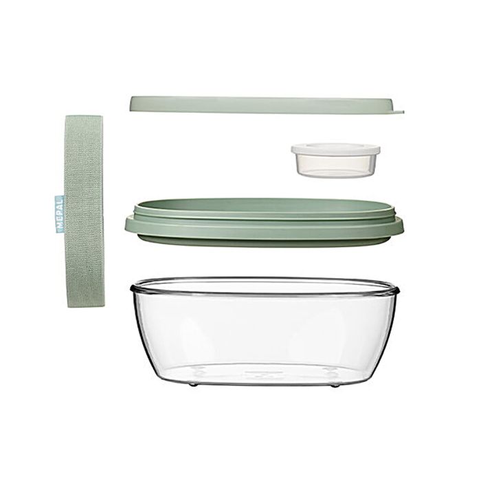 Contenedor con un compartimento desmontable, con espacio para pan y/o cubiertos. Viene con un mini contenedor ideal para extras como aderezos o snacks.