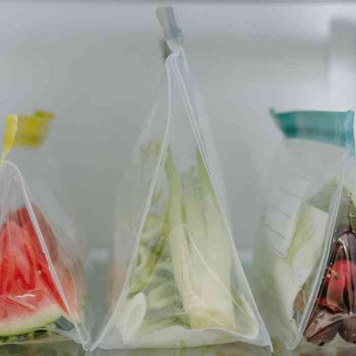 Set que incluye tres bolsas transparentes reutilizables de distintos tamaños, aptas para alimentos y sin BPA.
