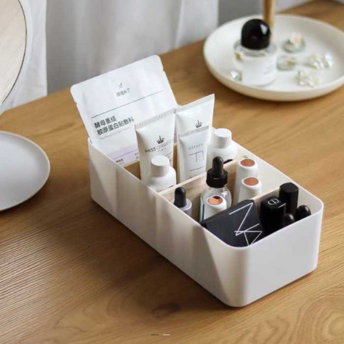 Organizador multiuso con divisiones de madera, ideal para organizar maquillaje y otros productos de baño.