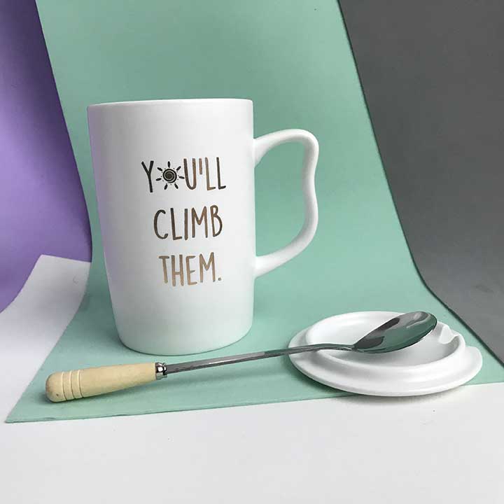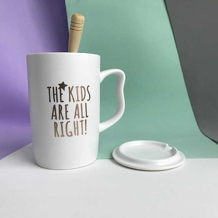 Taza chocolatera con tapa para mantener el calor y con cuchara con mango de madera. Tienen frases súper lindas y en tonos metalizados. Vienen en caja ideal para regalar.